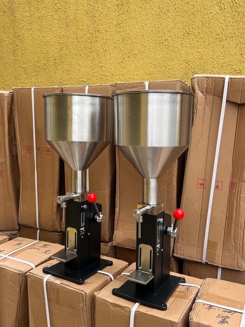Manual filling machine with tray to hold the container in place and black base which makes it beautiful, unique and aesthetically pleasing while still doing it’s job, volume of product dispensed per time (10ml-100ml) can be adjusted.
